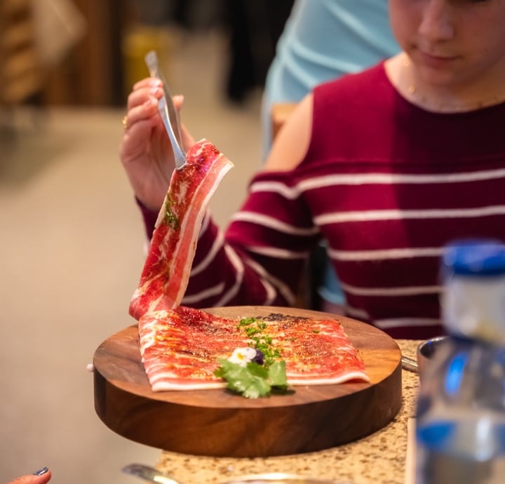 Cocina tus carnes marinadas al momento en tu propia parrilla integrada en la mesa.